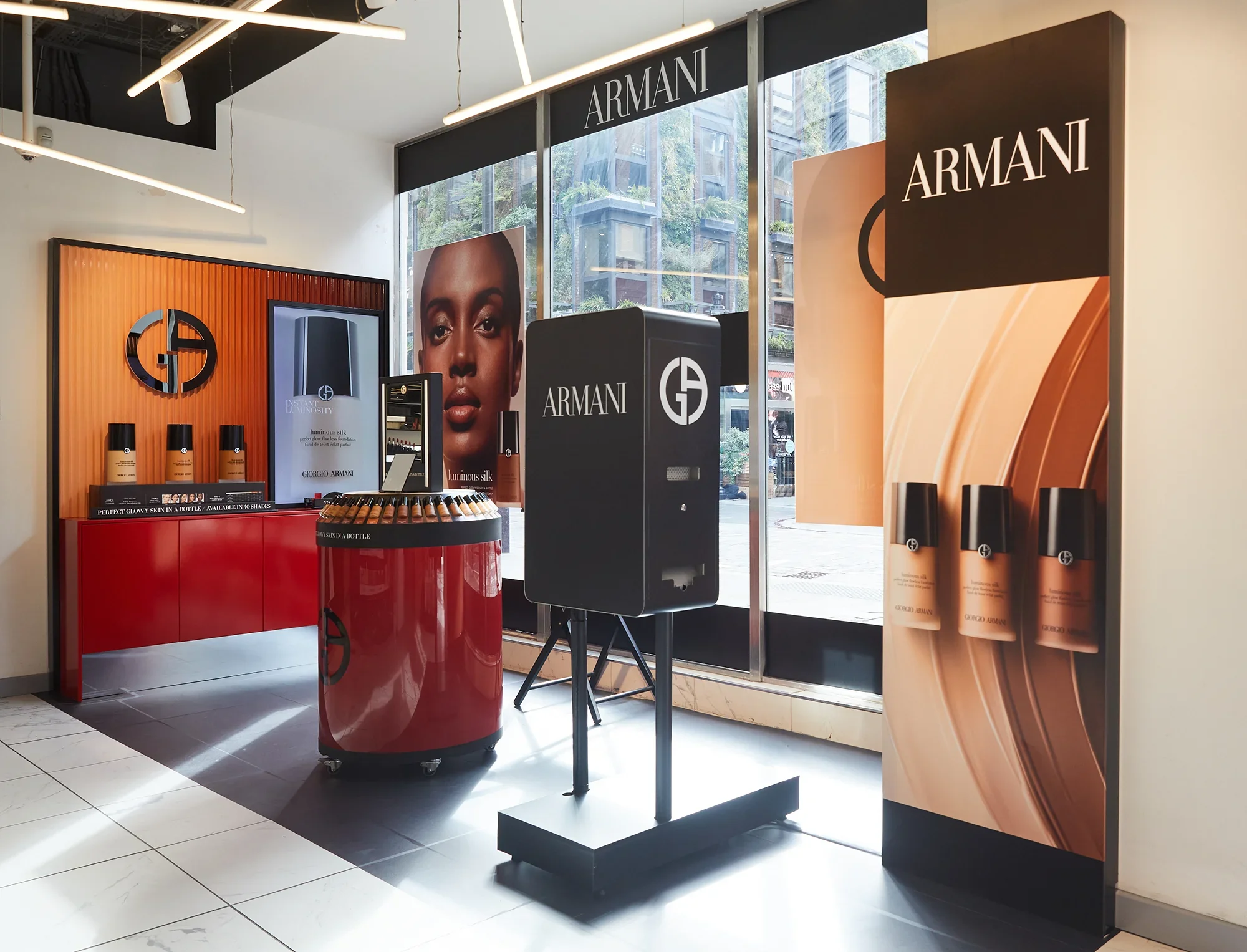 A custom made compact demonstration unit showcased all 40 foundation shades, providing makeup artists with everything they needed to engage visitors in a high-traffic environment, blending functionality with Armani’s signature design elegance.